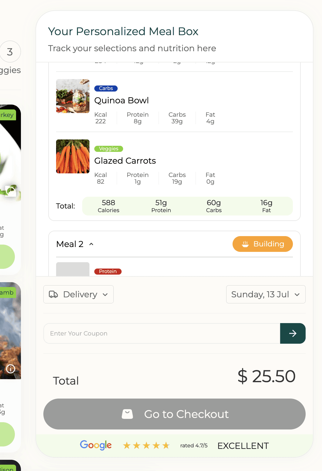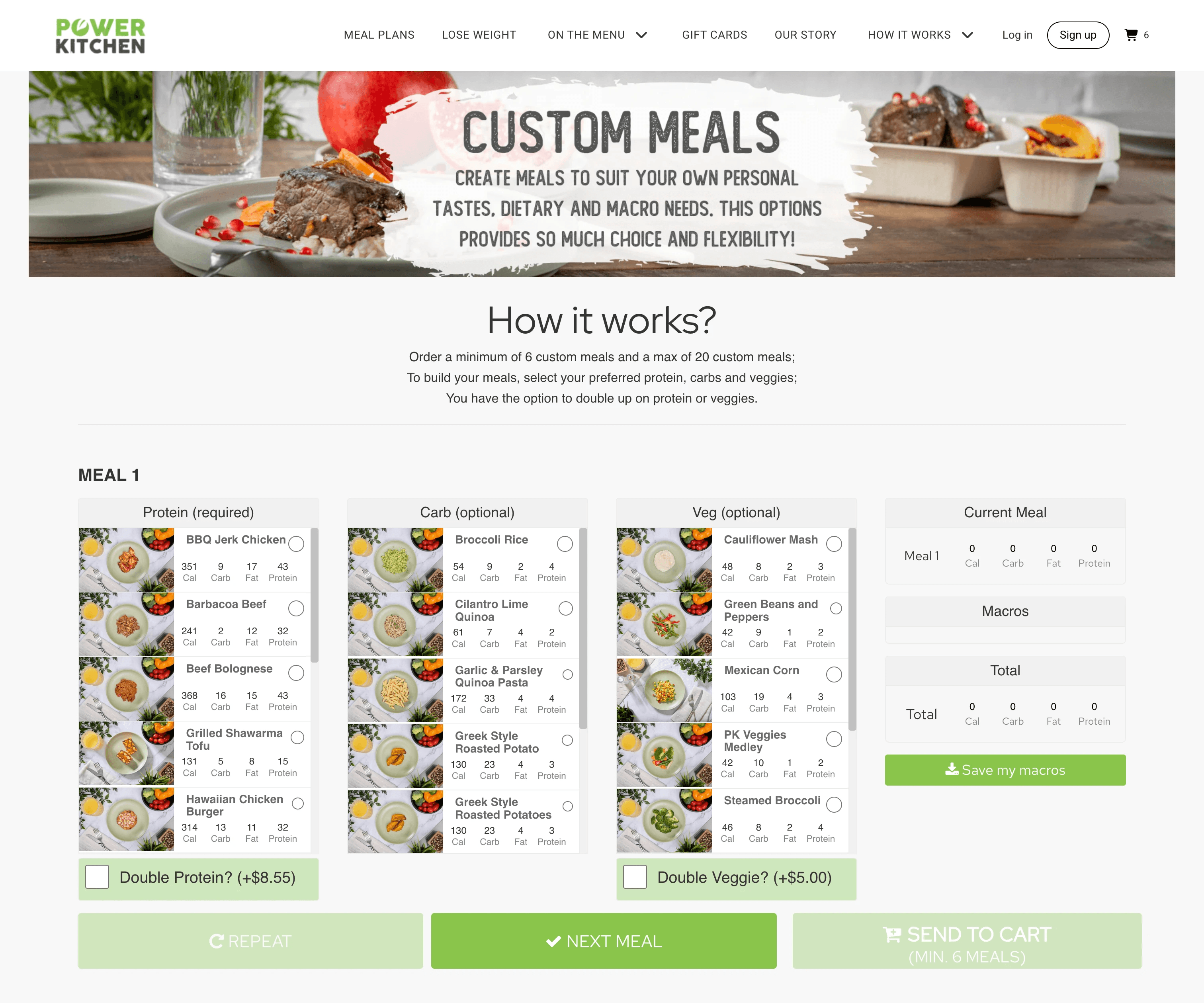 The Custom Meals feature allows customers to build personalized meal boxes by selecting their own proteins, carbs, and vegetables—a key differentiator in a competitive market.