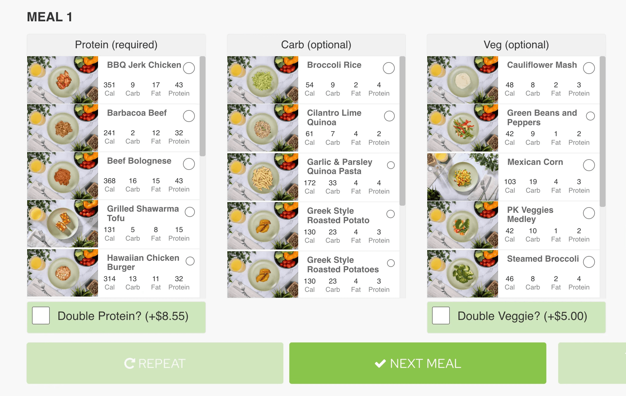 Double portion options (+$5.55 protein, +$5.00 carbs)